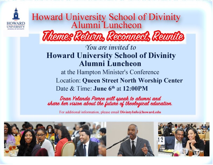 You are invited to join us at the Howard University School of Divinity Alumni Luncheon at the Hampton Minister's Conference. Our Theme this year is: Return, Reconnect, Reunite! The luncheon will be held at Queen Street North Worship Center and will begin at 12:00PM on June 6th.