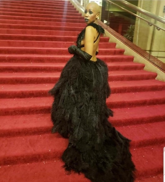 Entertainment journalist and red carpet Tanisha LaVerne Grant was right on message. With a look that takes her right into "Black Panther's" dora milaje tribe Tanisha wore a custom made black ostrich feathered gown by designer Lisa Jn Marie paired with black elbow length leathered opera gloves by Kiki De Montparnasse and stiletto slippers by Balmain.