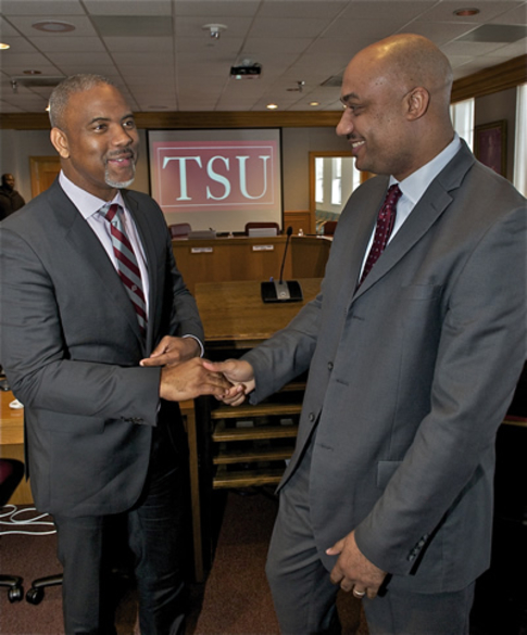 PHOTO: TSU President, Dr. Austin A. Lane (left) congratulating Kevin Granger (right) following the TSU Board of Regents' approval of Granger's appointment as vice president of intercollegiate athletics.