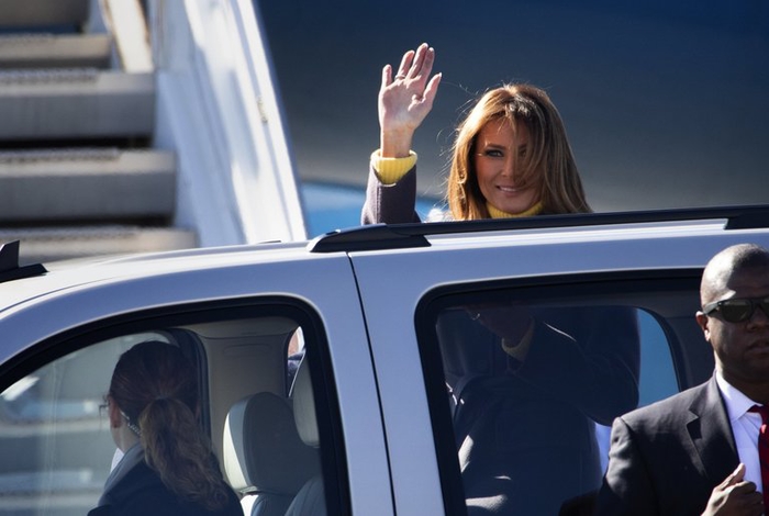 Melania Trump waves to the media before getting into a waiting vehicle at Boeing Field in Seattle on Monday afternoon. The first lady visited Microsoft to talk and learn about keeping kids safe online. (Ellen M. Banner / The Seattle Times)